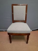 Pieds antérieurs tournés double poire irrégulières. Pieds postérieurs sabre. Ceinture carrée, devanture convexe. Dossier carré, dégagé à montants convexes face à 3 plates-bandes.