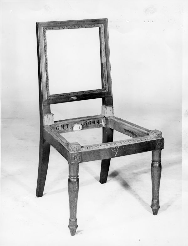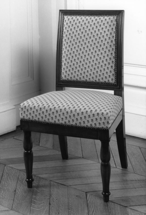 Versée au Mobilier national, le 9 avril 1923, dans une suite hétérogène de onze chaises, par le palais de Versailles, le musée et le cercle militaire (Arch. Mob. nat., MM6440, f° 213 v°, n° 8604 ; id., M96, f° 66 v°, n° 8604).