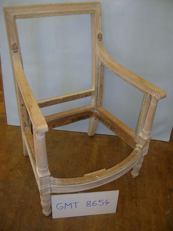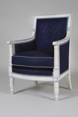 Pieds antérieurs tournés double poire sans bague. Pieds postérieurs sabre. Ceinture et dés à fond creux, devanture convexe. supports d'accotoirs tournés en colonne effilée baguée, sommet en doucine, base carrée à listels haut et bas. Accotoirs droits côtés fond creux et arêtes suéprieures arrondies nervées, tête à volutes, raccord concave et feuille d'eau. Joues pleines en reps bleu. Dossier à montants convexes, face fond creux. Siège à épaisseur, dossier et côtés à pelote sans ressorts.