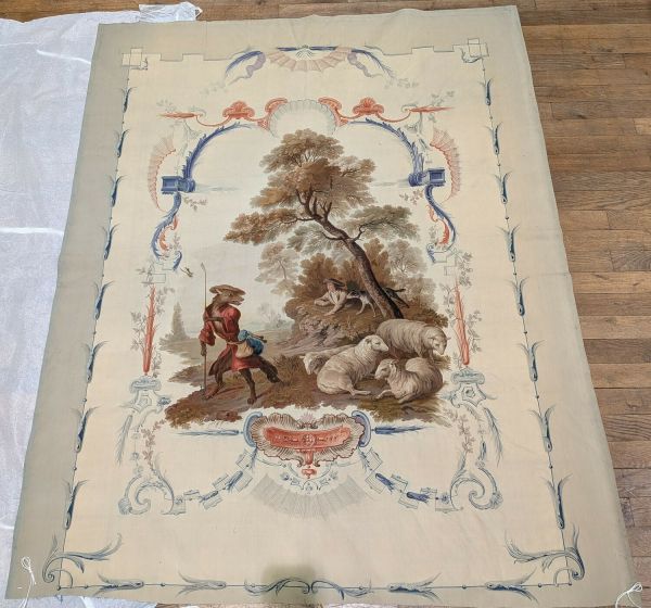 Tissage achevé à Beauvais le 18 avril 1917, d'après les cartons de Jean-Baptiste Oudry ; déposé le 2 mai 1924 au ministère de l’Éducation nationale, en même temps que le panneau "La Lice et sa compagne (GMT 8785) (Arch. M.N., B209, n° 1111 et 1134). De retour au Mobilier national en 1952.