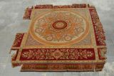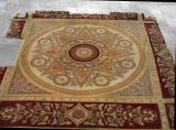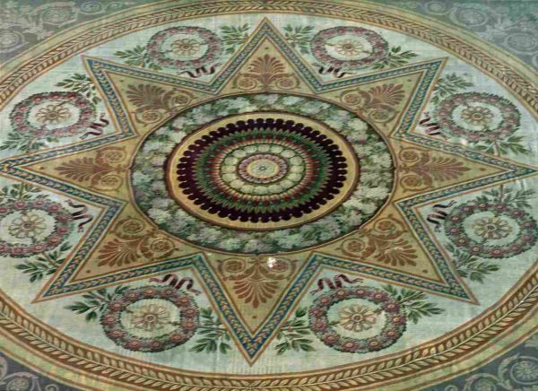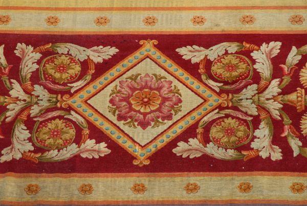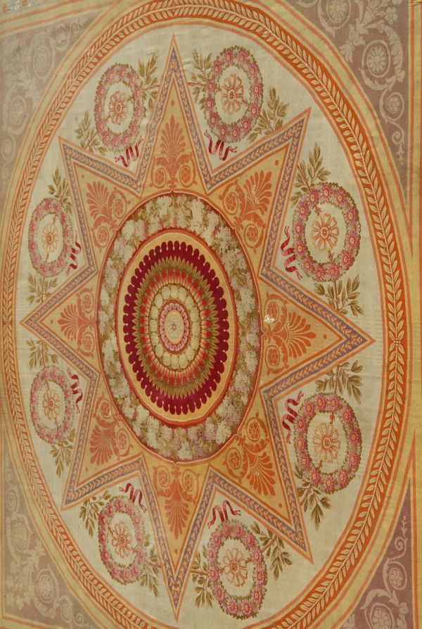 Fond général crème. Grand caisson central circulaire à centre en rosace mille feuilles à coeur or bordé d'une couronne lilas blanc fond dentelé en festons rouges. Grosse bordure circulaire à fond brique guirlande de lilas deux tons, très serrée. Au pourtour étoile à huit branches faite d'une bordure brisée à fond mauve et culots or, en enfilade listels roses espacés. Au centre des branches palmettes sur deux rinceaux en volute rose et entre celles-ci couronnes de marguerites roses entourant une rosace or et reliées par feuillage laurier en fond. Encadrement du caisson fond brique et palme laurier crème. Aux quatre angles écoinçons gris pâle à motif de rinceaux en volute et culots crèmes bordés double listel rose. Large bordure extérieure fond rouge à quatre motifs circulaires en angle et en losange aux axes; entre ces motifs, rinceaux doubles d'acanthe à fleurs crèmes et roses; bordée intérieur et extérieur et se coupant aux angles d'un listel crème à bords et rosaces or. Une partie de bordure extérieure caissons à fond brique à guirlandes et rosaces de feuillage vert.