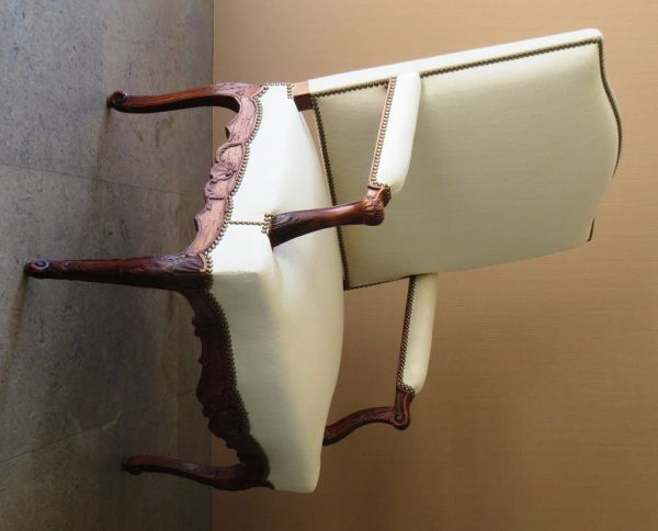 Supports d'accotoir en retrait débillardés arrondis, présentant des feuilles d'acanthe à la base des consoles, d'autres à l'extrémité terminée en volute. Accotoirs droits recouverts sauf listels à la base et la tête en doucine arrondie et à feuille. Les accotoirs ont été entaillés ultérieurement afin de disposer des manchettes.