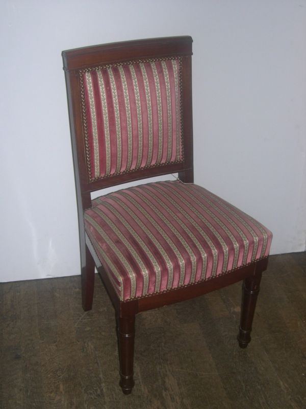 Pieds tournés, bagués, évasés à la base - Ceinture unie - Devanture convexe - Dossier dégagé concave à fond creux surmonté d'un listel arrondi. Siège et dossier à épaisseur - sans ressorts.