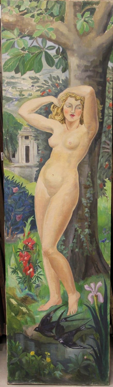 Femme nue placée au sein d'une nature luxuriante, debout devant un arbre. Au premier plan, devant le modèle, deux hirondelles