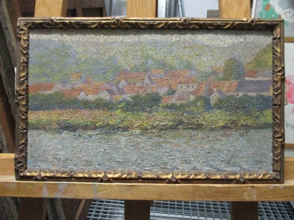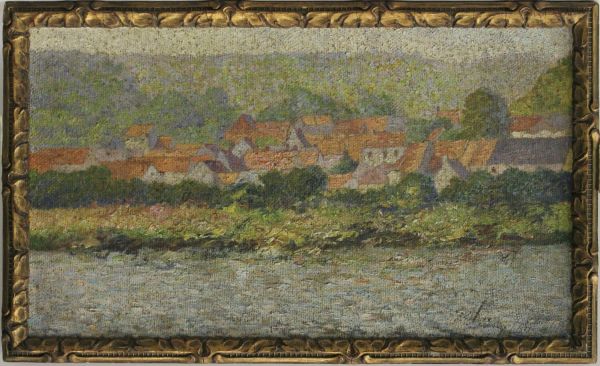 Oeuvre qui pourrait correspondre à l'oeuvre "Ensemble d'un village au bord de la Seine" (1911-99) répertoriée en G294, Inventaire des études de peinture [...] exécutées par des artistes-tapissiers de la Manufacture
