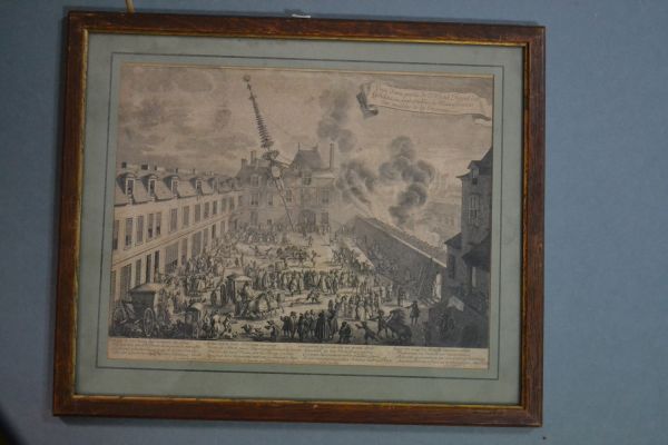 Gravure représentant la Cour de l'Hôtel Royal des Gobelins sous Louis XIV à l'occasion d'une fête organisée en l'honneur de M. Le Brun premier peintre du Roy.
