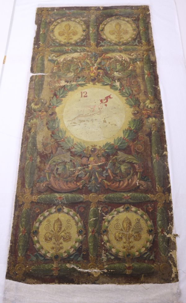 Sur fond amarante, la composition est divisée en cinq compartiment dont le central est occupé par un médaillon circulaire en réserve à fond blanc. Les quatre autres médaillons présentent une fleur de lys héraldique et sont cernés par des tores de feuilles de laurier ponctués de cabochons imitant les pierres précieuses.
