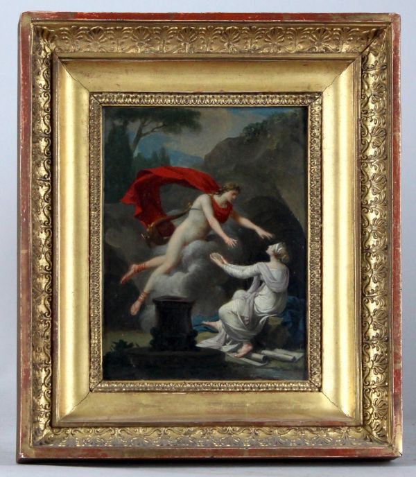 Scène mythologique avec Apollon et La Pythie qui est à droite vêtue de blanc, assise sur un rocher, elle tend une offrande vers Apollon qui est à gauche de la composition vêtu d'une draperie rouge et d'une lyre.