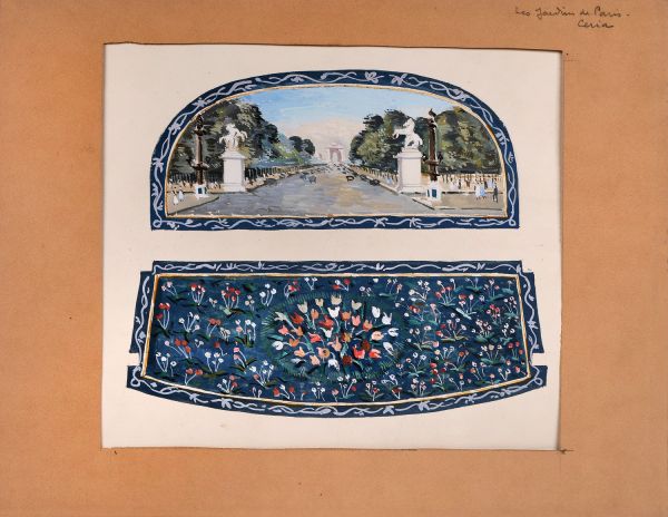 Edmond Céria livre au Mobilier national en 1937 un projet de garniture de mobilier en tapisserie sur les monuments des jardins parisiens comprenant un canapé (GMTB 558), une chaise (GMTB 556) et un fauteuil (GMTB 557).