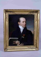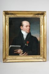 Portrait d'un homme au crane dégarni, en chemise à cravatte et redingotte arborant deux décorations dont la croix de la légion d'honneur. Au dos une étiquette portant du Baron Lucas médecin de la Duchesse d'Angoulême.
