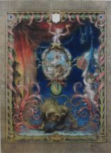 Un médaillon central, auquel est suspendu un plus petit représentant un coq, est surmonté d'un enfant tenant deux torches allumées. Au premier plan, un lion avec à droite un enfant brandissant un drapeau. Une bordure, composée d'un tore or, de rubans et de cocardes, encadre la composition.