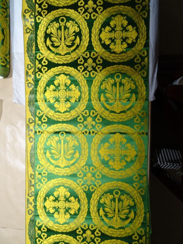 Lé de damas de satin vert et dessin jaune. Les deux lisières sont toujours présentes. Le décor s’organise en frises de couronnes de laurier maintenues par des rubans et agrémentées de fleurs de lys. Elles sont séparées par des ornements décoratifs et contiennent des ancres de marine et des rosaces formées de palmettes et de fleurons.