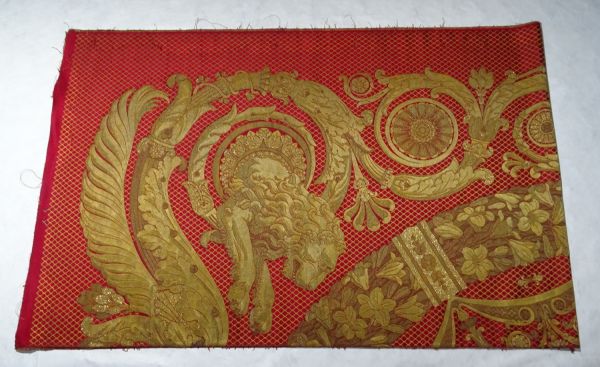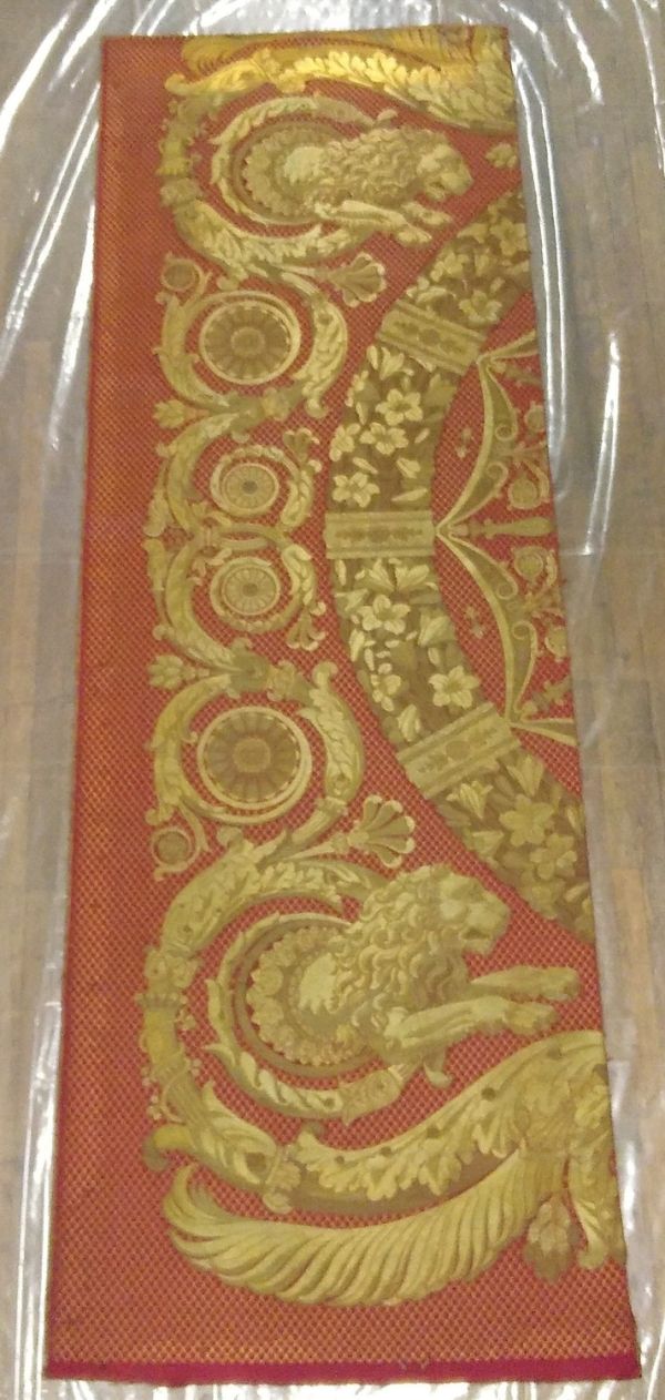 Lé gauche de panneau de tenture du meuble d'été de la salle du Trône de Louis XVII aux Tuileries. Soie, or filé, or frisé, or lamé, canetille d'or.