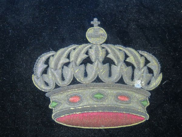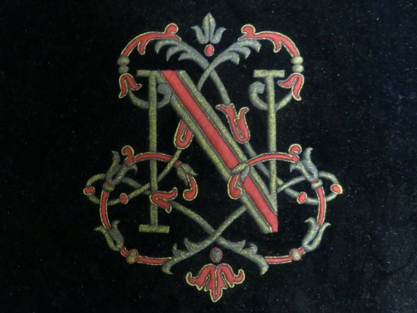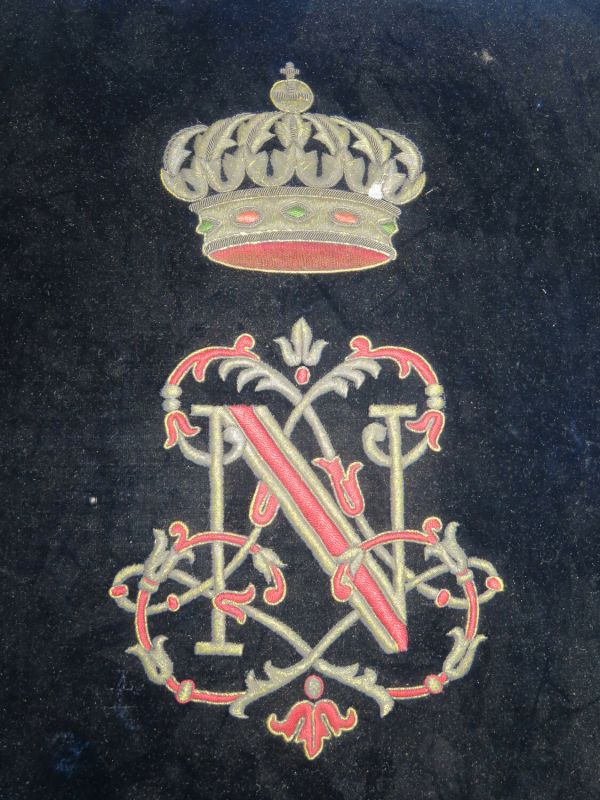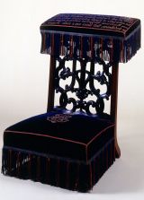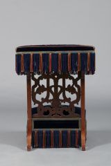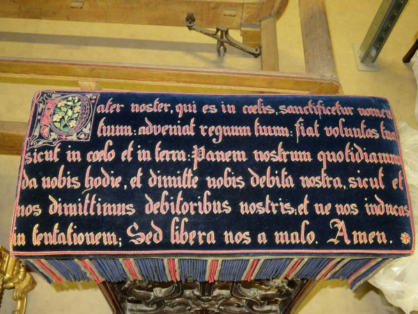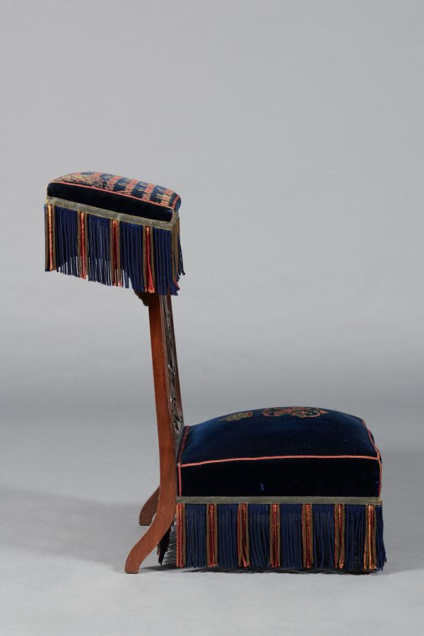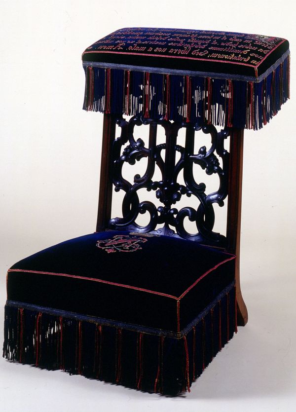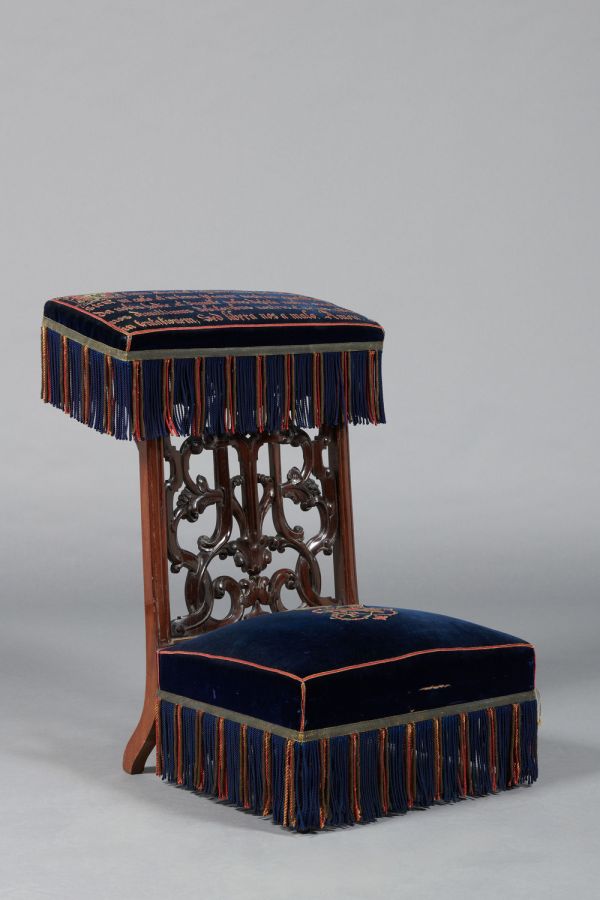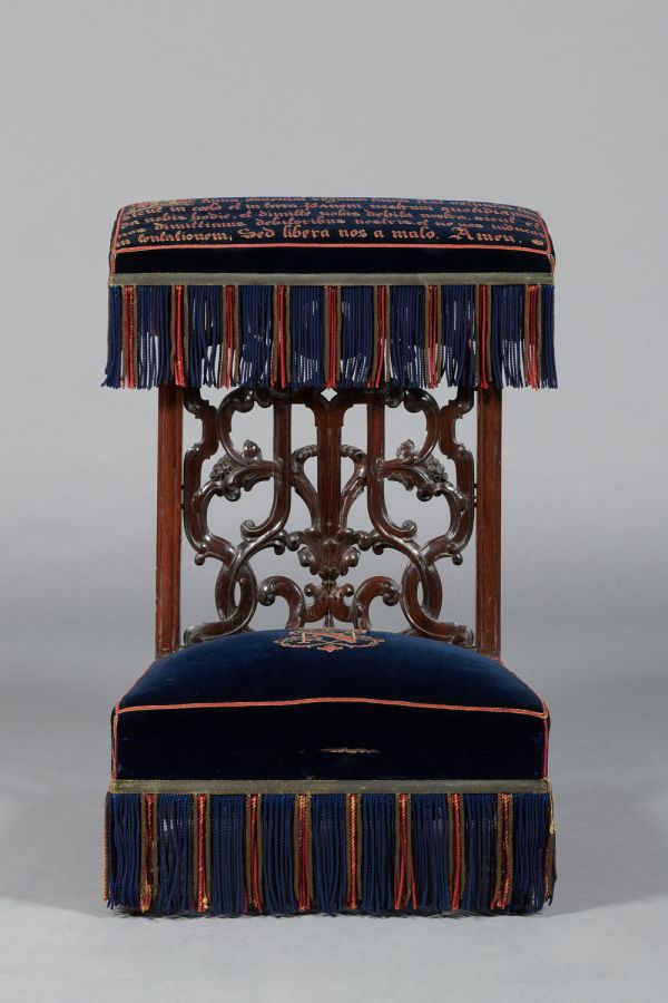 palissandre sculpté, velours de soie bleu brodé. Le pater noster en latin est bordé en lettres gothiques sur l'accoudoir tandis que l'agenouilloir est orné du chiffre LN (Louis Napoléon, pour Napoléon III) surmonté d'une couronne.