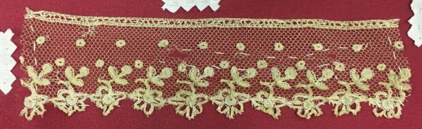 - Fragment de volant en dentelle, bord inférieur festonné formé d'une rangé de fleurs stylisées, semis de pois, monté sur un pongé de soie rose.