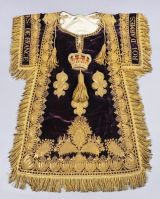 Habit de roi d'armes de France en velours de soie violet brocart or, décoré de fleurs de lis, d'une couronne royale et orné de frange à torsades.