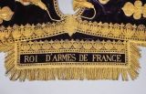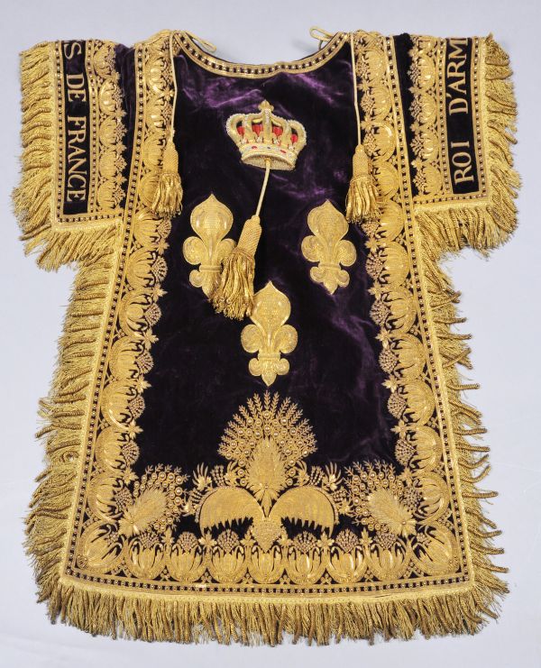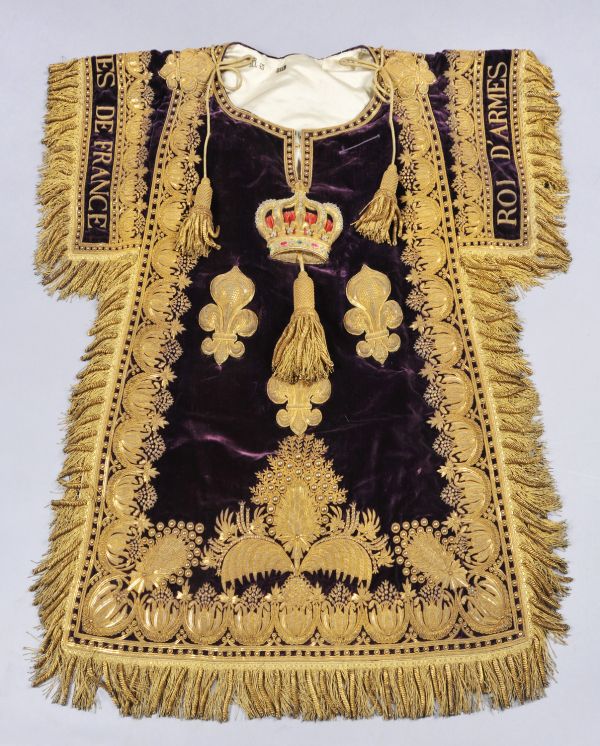 Tabard du chevalier Delahaye, roi d’armes de France (chef des hérauts d’armes), ayant servi lors du sacre de Charles X le 29 mai 1825. Un document d’époque le décrit comme « une tunique en dalmatique en velours violet richement brodé en or, frange et glands or à torsades, doublée en taffetas blanc, distinguée par une couronne royale brodée dans le milieu » ("Habillement de Messieurs les hérauts d'armes de France", AN, AJ18 809, fol. 5 à 8). Le Mobilier national conserve également les tabards des douze hérauts d’armes du sacre (GMTC 147).
