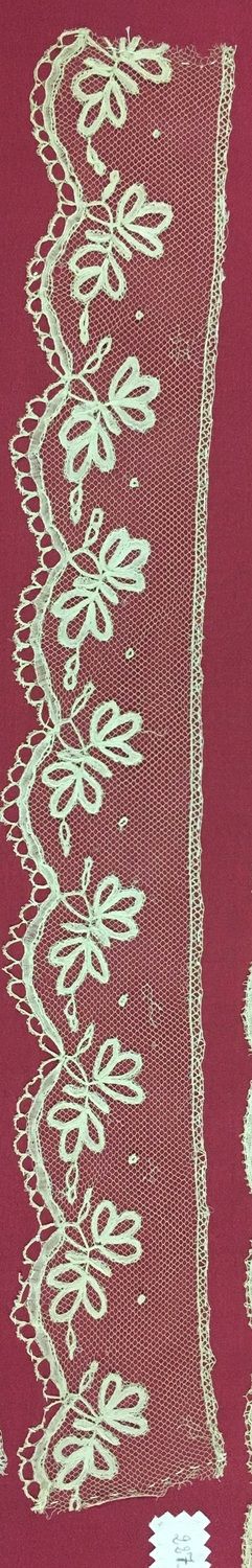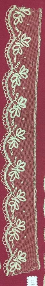 - Morceau de volant de dentelle, bord inférieur festonné surmonté de tiges feuillagées, une rangée de pois, monté sur un pongé de soie rose.