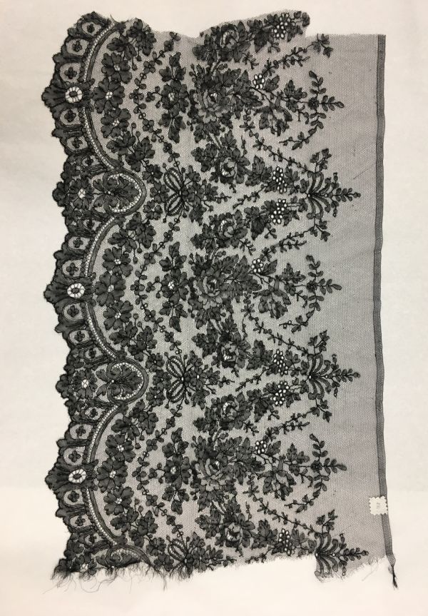 Morceau de volant de dentelle noire de Chantilly aux fuseaux, bord inférieur festonné orné de palmes, de médaillons et d'une frise de perles, surmonté de deux tiges sinueuses fleuries et feuillagées, surmonté de bouquets de floraux et feuillagés travaillés en guirlande.