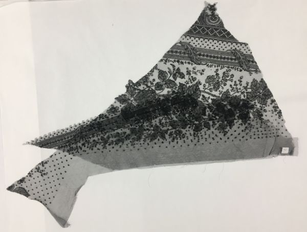 Morceau de volant de dentelle noire de Chantilly aux fuseaux, découpé, orné de frises feuillagées, d'un décor de damier, de deux frises de perles abritant un semis de pois, surmonté d'une colonne cannelées avec frise de perles et fleurs stylisées travaillées en bande, une tige feuillagée est enroulée autour, surmonté d'une branches avec tiges feuillagées et fleuries, semis de pois.