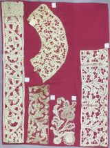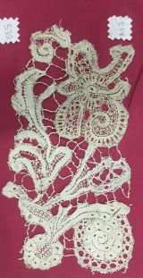 Morceau de dentelle de type Flandre, Italie du Nord, orné de deux grosses fleurs stylisées aux pétales ajourés naissant de tiges aux feuilles sinueuses stylisées, motifs reliés par des brides tressées et picotées, monté sur un pongé de soie rose.