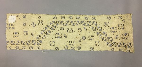 Bande d'entre-deux en point coupé, fin du XVIe, début du XVIIe siècle, toile de fond brodée de motifs décoratifs en léger relief et ajourée de motifs géométriques de carrés et de pois remplis de motifs décoratifs ainsi que des frises de zig-zag.