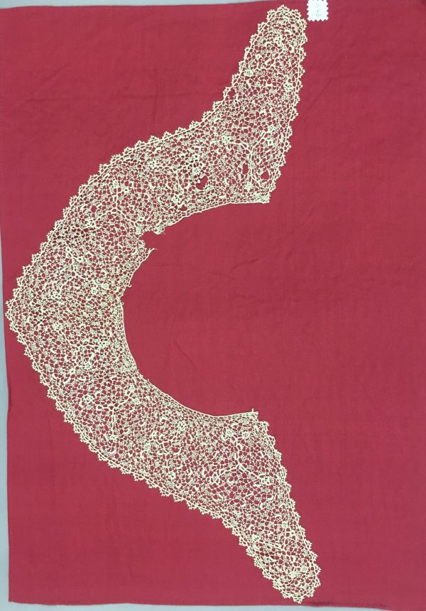 Col châle en dentelle d'Irlande au crochet orné de motifs celtes à trois branches terminées par des contre-courbes et motifs floraux stylisés sur un dense réseau de mailles tressées picotées, bords extérieurs festonnés, monté sur un pongé de soie rose.