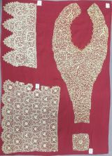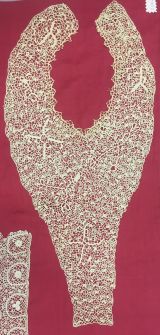 Pièce de dentelle d'Irlande au crochet de forme allongée (col ?) ornée de motifs celtes à trois et quatre branches, de petites fleurs stylisées et divers motifs décoratifs sur un dense réseau de mailles irrégulières picotées ou festonnées, bord intérieur festonné, monté sur un pongé de soie rose.
