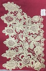 Morceau de volant de dentelle d'Irlande au crochet orné d'un épais rinceau à deux rangées d'ajours en partie médiane, duquel partent différentes variétés de grosses fleurs et feuilles stylisées en partie supérieure et duquel tombent des fleurs aux pétales pointus travaillés en médaillons venant découper le bord inférieur, fond en grandes mailles carrées à gros picots ronds, bord supérieur festonné, monté sur un pongé de soie rose.