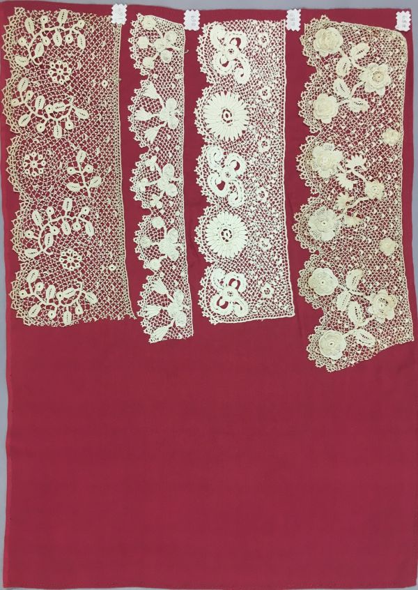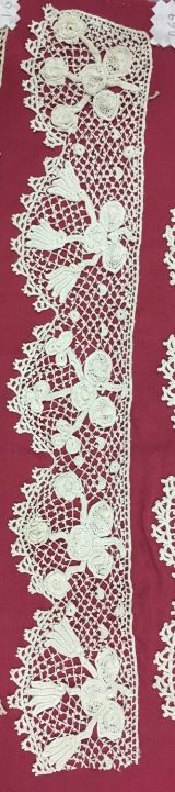 Morceau de volant de dentelle d'Irlande au crochet orné d'un motif répétitif de trois petites fleurs desquelles partent trois tiges chacune terminée par une petite fleur stylisée, ou des palmettes ou des trèfles irlandais, fond en mailles carrées picotées, bord inférieur festonné et dentelé, monté sur un pongé de soie rose.