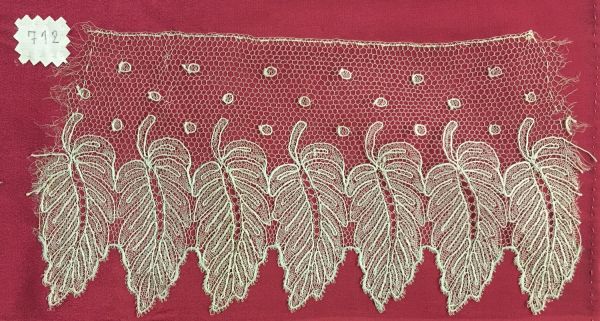 Morceau de volant de dentelle Blonde aux fuseaux à fils continus, milieu ou fin du XVIIIe siècle, fils en soie crème, partie basse ornée d'une succession de feuilles tombantes aux nervures découpées, partie supérieure semée de pois pleins, motifs cernés d'un fil de soie blanc plus épais, réseau de mailles à fils croisés, bord inférieur picoté, monté sur un pongé de soie rose.