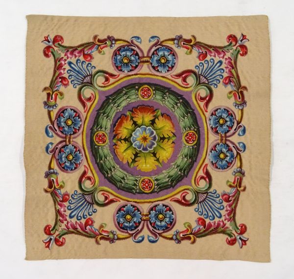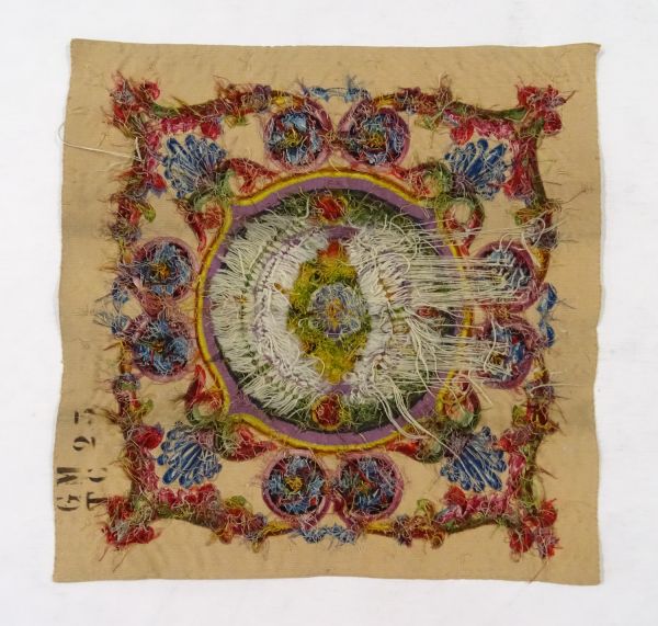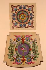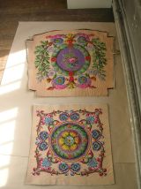 Une rosace bleue entourée de fleurs oranges au milieu d'une couronne de feuilles et rosaces sur fond violet. Le tout entouré de rinceaux, palmettes et arabesques multicolores sur fond chamois. Décor semblable à GMTC 43.