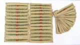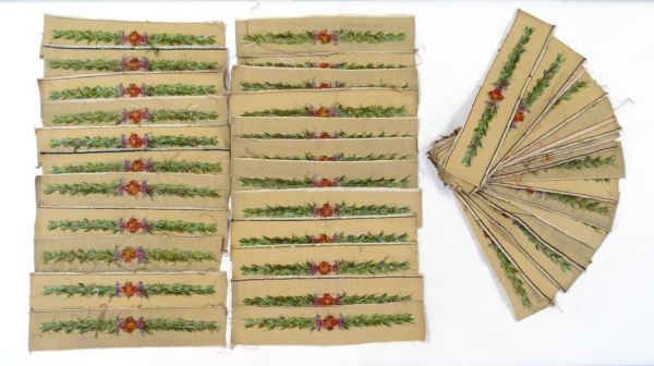 Décor symétrique de branches de buis de part et d'autre d'une rosace centrale rouge sur fond chamois.