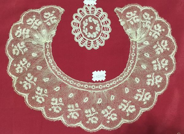 Col rond en dentelle de Valenciennes aux fuseaux à fils continus, Nord de la France, deuxième moitié du XVIIIe siècle, décor de petites branches feuillagées et fleuries et de pois, une frise de perles orne le pourtour intérieur, bord inférieur festonné et picoté, motifs travaillés en toilé serré et uniforme, réseau de mailles rondes tressées sur tous les cotés.