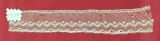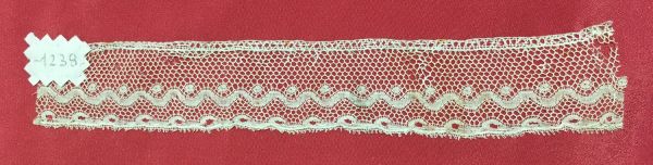 Volant de dentelle de Valenciennes aux fuseaux à fils continus, Anvers, deuxième moitié du XVIIIe siècle, décoré d’un lacet sinueux dont les parties concaves supérieures accueillent un pois plein, de petits médaillons en partie inférieure, motifs travaillés en toilé, réseau de mailles rondes tressées sur tous les cotés, bord inférieur picoté, engrêlure mécanique.