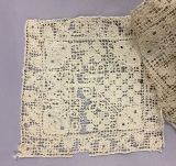 Filet brodé de forme carré en coton écru, XIXe ou XXe siècle, fond en mailles carrées nouées aux quatre coins, décor composé d'un arbuste à enroulements disposé en partie médiane duquel partent deux feuilles venant orner les écoinçons, bordure ornée d'un rinceau feuillagé et fleuri stylisé.