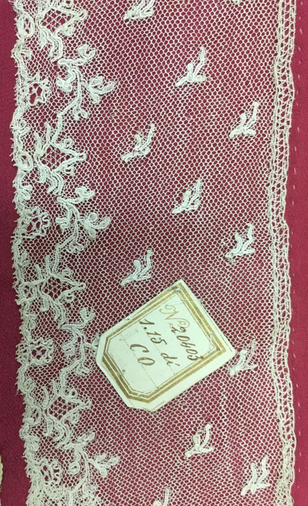 Volant de dentelle de type Malines aux fuseaux à fils continus, fond de glace, décoré en bordure inférieure d’un alignement de médaillons formés par des rinceaux et reliés par des tiges feuillagées, semis de feuilles stylisées, contours cernés par un fils plus épais, réseau de mailles à quatre fils croisés trois fois sur les deux côtés parallèles à la lisière, bord inférieur picoté, engrêlure.
