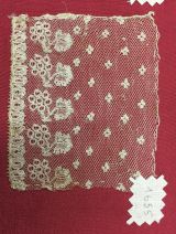 Volant de dentelle de type Malines aux fuseaux à fils continus, fond de glace, orné en bordure inférieure de petites feuilles surmontées d’un alignement de fleurs renversées, surmontées d’un semis de petites fleurs stylisées, motifs travaillés en toilé fin, contours cernés par un fils plus épais, réseau de mailles à quatre fils croisés trois fois sur les deux côtés parallèles à la lisière, bord inférieur picoté.