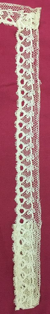 Volant de dentelle de Lille aux fuseaux à fils continus, fond clair, orné en bordure inférieure d’une frise de perles surmontée d’une frise de petites feuilles stylisées et de petits carrés semés au point d’esprit, motifs cernés par un fil plus épais, bord inférieur picoté.