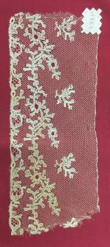 Volant de dentelle de Lille aux fuseaux à fils continus, fond clair, orné en bordure inférieure de médaillons ajourés et de petites feuilles, surmonté d’un rinceau feuillagé et fleuris se déployant sur toute la partie horizontale médiane, suivi d’une rangée de branches feuillagées, motifs travaillés en toilé fin et cernés par un cordonnet, bord inférieure picoté.