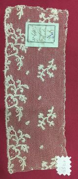 Volant de dentelle de type Malines aux fuseaux à fils continus, fond de glace, orné de branches feuillagées et fleuries naissant de médaillons en bordure inférieure, semis de pois pleins et de rameaux, motifs travaillés en toilé fin et cernés par un cordonnet, réseau de mailles à quatre fils croisés trois fois sur les deux côtés parallèles à la lisière, bord inférieur picoté.
