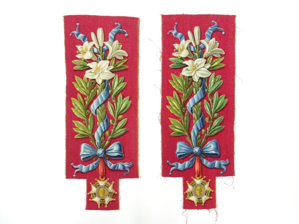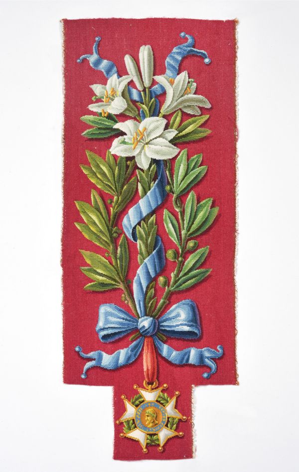 Décor : fond cramoisi avec branches de lys, feuilles de lauriers avec ruban bleu entremêlé et noué à la base.