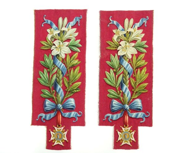 Décor : fond cramoisi avec branches de lys, feuilles de lauriers avec ruban bleu entremêlé et noué à la base.