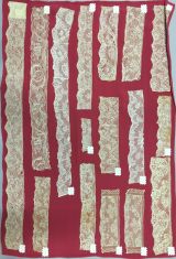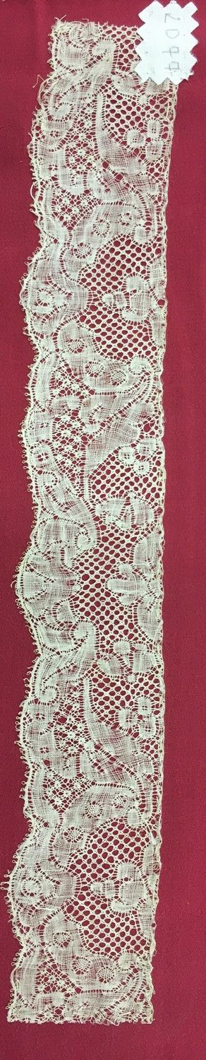 Volant de dentelle aux fuseaux à fils continus de type Flandre, réseau à fond à cinq trous, décor composé de longues feuilles, de fleurs et de rinceaux stylisés déployés sur toute la surface, motifs travaillés en toilé fin, bord inférieur picoté et festonné.