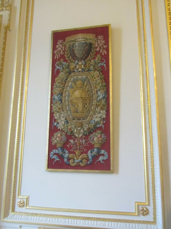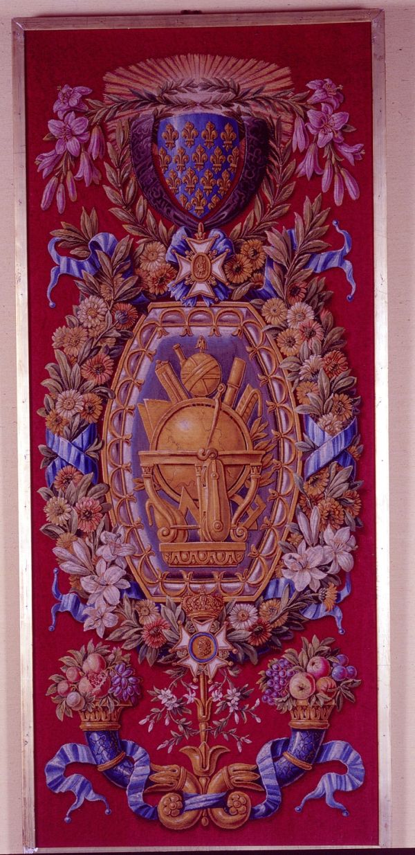 Fond cramoisi - médaillon central forme bouclier sphère terrestre, instruments et attributs entourés de branches de torsades de fleurs surmontées de l'écusson au fleurs de lys sur fond fleur - couronne et soleil ruban avec croix à 4 branches (celle de Saint Louis) à la partie inférieure croix de la légion d'honneur soutenue par 2 cornes d'abondance.