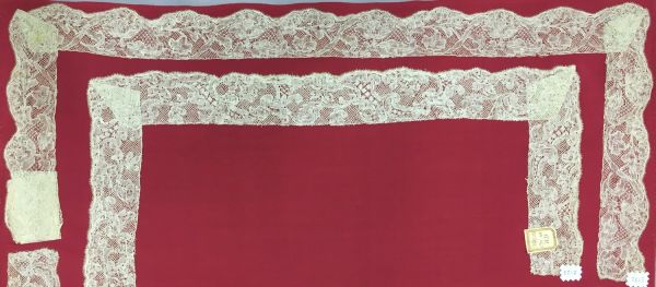 Volant de dentelle de type Binche aux fuseaux à fils continus, décor composé de rinceaux sinueux entrelacés à grosses fleurs et feuilles stylisées, motifs travaillés en toilé et cernés par un cordonnet, fond neige, bord inférieur festonné, picotage mécanique postérieur.