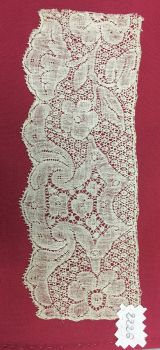 Volant de dentelle de type Binche aux fuseaux à fils continus, décoré d’un cartouche d’où partent deux palmes en partie basse et de tiges fleuries, fond de neige, motifs travaillés en toilé, bordure inférieure festonnée et picotée.