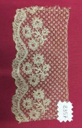 Volant de dentelle de Lille aux fuseaux à fils continus, fond fantaisie, décoré en bordure inférieure d’une guirlandes de fleurs surmontée de trois bouquets alignés, motifs travaillés en toilé fin et cernés par un cordonnet, bord inférieur picoté et festonné.