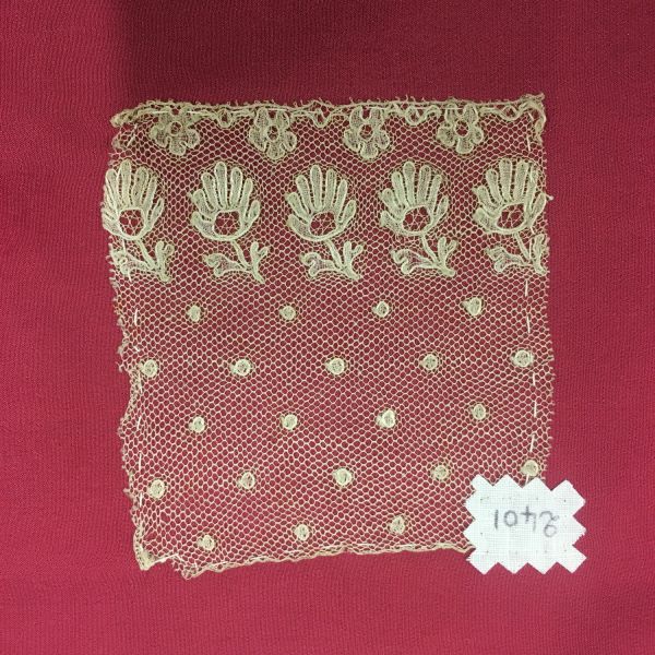 Volant de dentelle de type Malines aux fuseaux à fils continus, décoré en bordure inférieure d’un alignement de petites fleurs surmonté de fleurs renversées et d’un semis de pois, motifs cernés par un cordonnet, réseau de mailles à quatre fils croisés trois fois sur les deux côtés parallèles à la lisière, bord inférieur picoté.