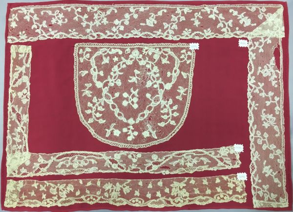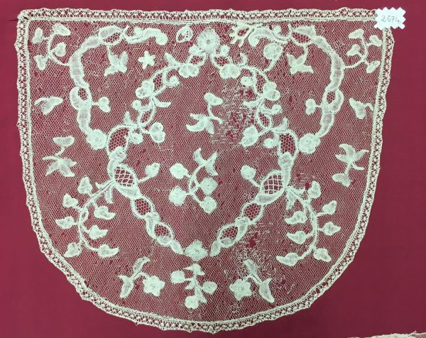 Fond de bonnet en dentelle de Bruxelles aux fuseaux à pièces rapportées, XVIIIe ou XIXe siècle, fond drochel, décor composé d’une guirlande de motifs végétaux et de cartouches d’où partent des tiges feuillagées et autour de laquelle sont disposées de petites fleurs à tige à deux feuilles, motifs travaillés en toilé serré avec un ramassage de fils sur les côtés formant un léger relief, une bordure extérieure.